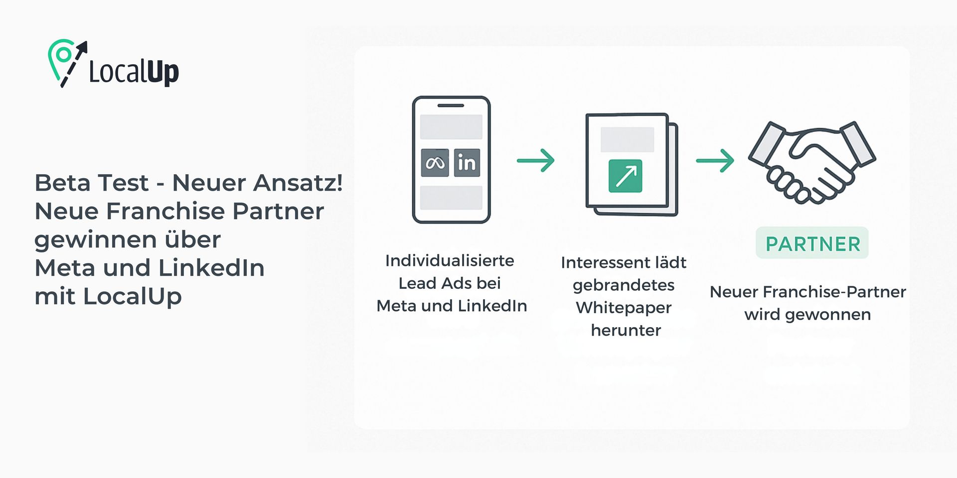 Nach dem Austausch mit einigen Franchise-Experten hat sich LocalUp Gedanken über einen anderen Ansatz zur Generierung von Kontakten möglicher neuer Franchise-Partner gemacht. Erste kleine Tests mit B2B-Lead Anzeigen der Idee liefen positiv, sodass LocalUp nun den nächsten Schritt geht und gemeinsam einen Proof of Concept in der Franchise-Branche schaffen möchte.